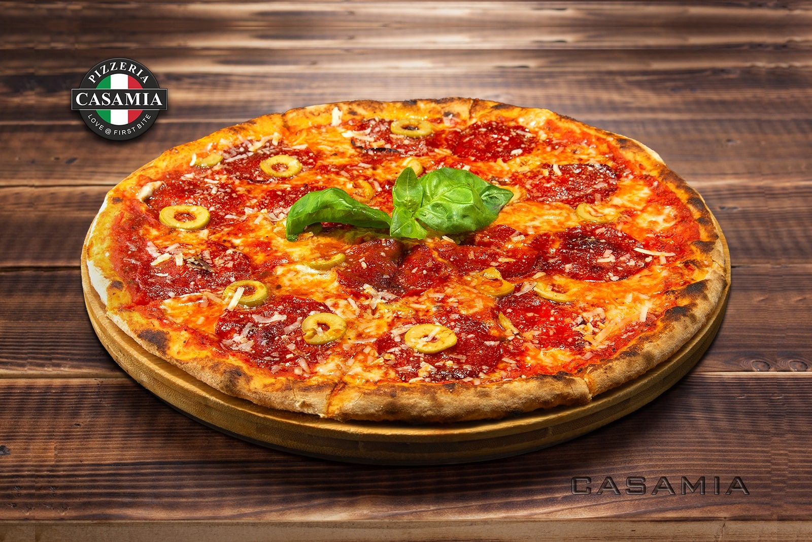 Casamia pizza sauce, mozzarella fior di latte, chorizo, olives, fresh basil
