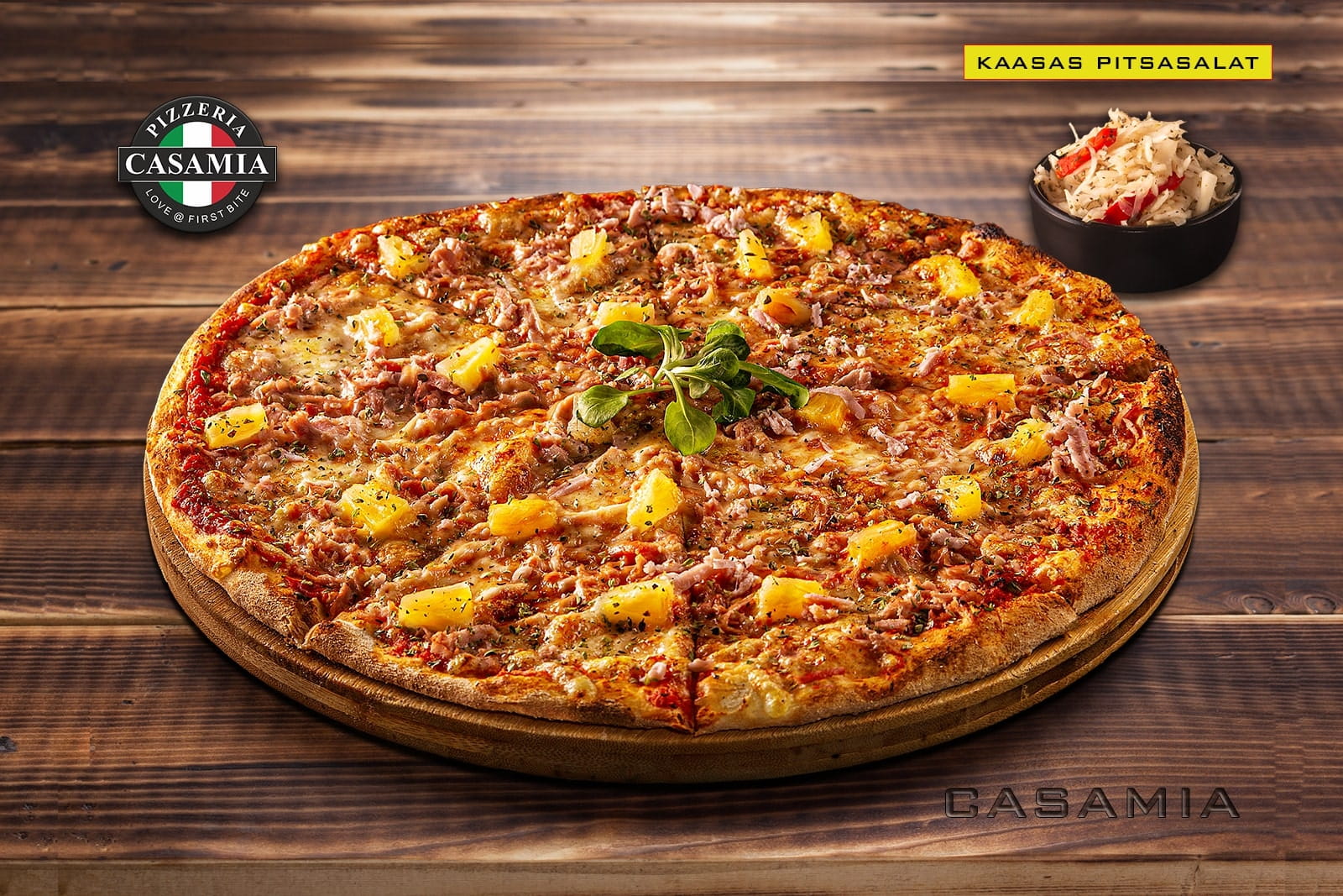 Casamia pizza sauce, gouda cheese, shredded smoked ham, pineapple, oregano + Swedish pizza salad