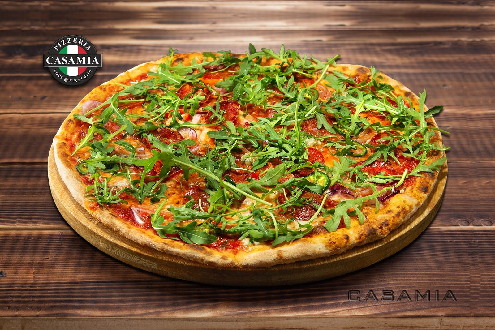 Casamia pizza sauce, mozzarella fior di latte, gorgonzola piccante, salame piccante, red onion jalapeno, arugula, pesto